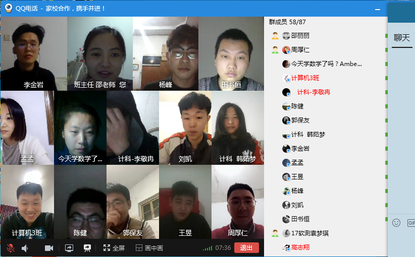班会中受邀员工家长与班主任、员工们积极交流,家长提出了对在家学习效果的关心,表示一定尽力配合学校工作,克服困难,为同学们创造一个优异的学习环境。家长对老师们的辛勤付出与深切关怀表示感谢,并将加强监督,保障员工网课出勤及学习质量。员工家长代表贺景菊认为员工在家应合理作息,适当运动,通过读书等方式补充自己的知识,并表示配合学校安排,做好家校共育。员工代表积极响应班主任和家长要求,纷纷表示:从现在做起,合理安排作息,积极配合网课教学,提高专业素质,加强自控能力。